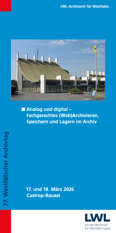 Der 77. Westfälische Archivtag findet am 17. und 18. März 2026 in Castrop-Rauxel statt. Das Thema lautet „Analog und digital – Fachgerechtes (Web)Archivieren, Speichern und Lagern im Archiv“.